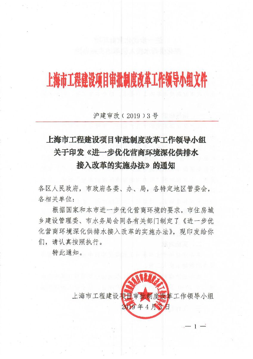 滬建審改〔2019〕3號 《上海市工程建設項目審批制度改革工作領導小組關于印發(fā)<進一步優(yōu)化營商環(huán)境深化供排水接入改革的實施方案>的通知》
